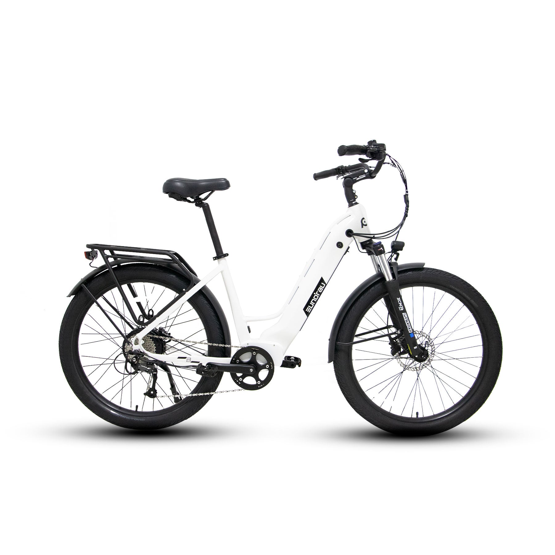- Plus, it comes with a rear rack and fender, city tires, hydraulic disc brakes, aluminum alloy pedals, and a comfortable suspension seat.